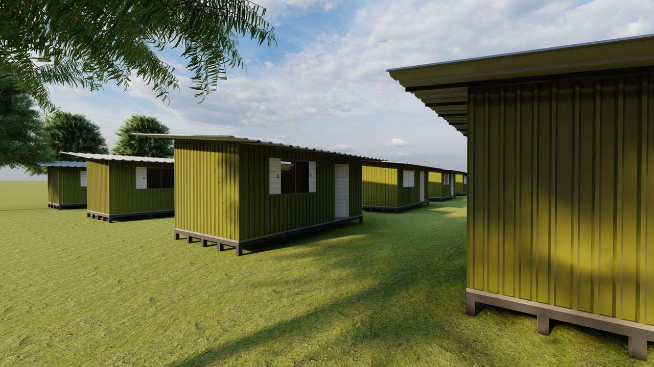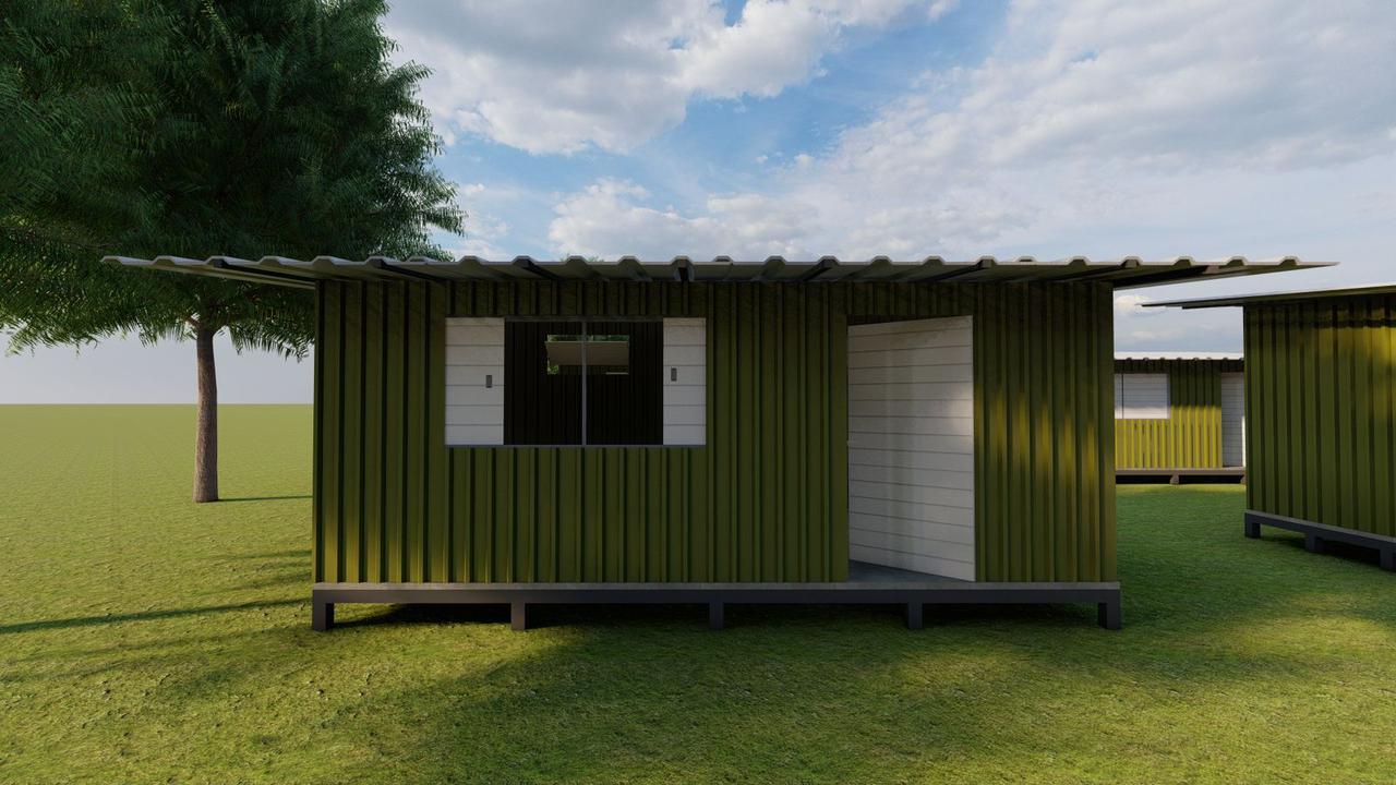 Casas temporárias utilizando madeiras de reflorestamento em módulo construtivo medindo 3.64 m x 6.10 m. Sendo 22,20 m² capazes de abrigar até 6 pessoas.